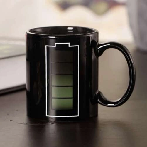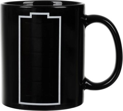 Vajag uzlādēt enerģiju? Šī maģiskā krūze to parādīs burtiski. Ielejot karstu dzērienu, baltā baterijas ikonas kontūra pakāpeniski piepildās ar zaļu krāsu – it kā baterija lādētos. Dzērienam atdziestot, krāsa izzūd, tāpēc vienmēr zināsiet, kad ir laiks nākamajam malkam.