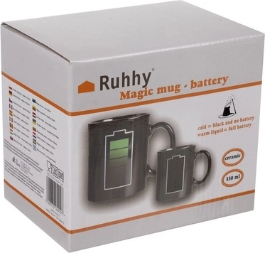 Stilīga melna keramikas krūze ar termojutīgu baterijas apdruku, kas, ielējot karstu dzērienu, “uzlādējas” zaļā krāsā. Maģiskais efekts tiešraidē parāda, cik karsts ir dzēriens, piešķirot jebkurai kafijai vai tējai jautru un oriģinālu akcentu. Krūzes tilpums ir 330 ml, tai ir ērta roktura forma un tā izgatavota no drošas keramikas, kas piemērota saskarei ar pārtiku.