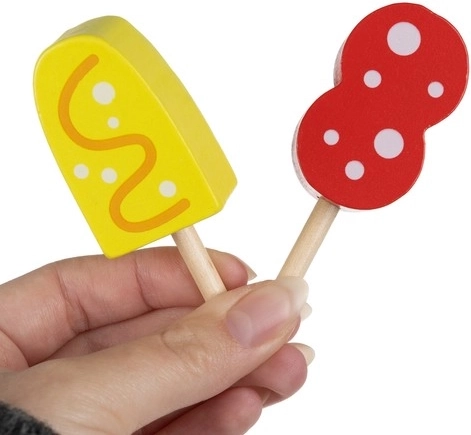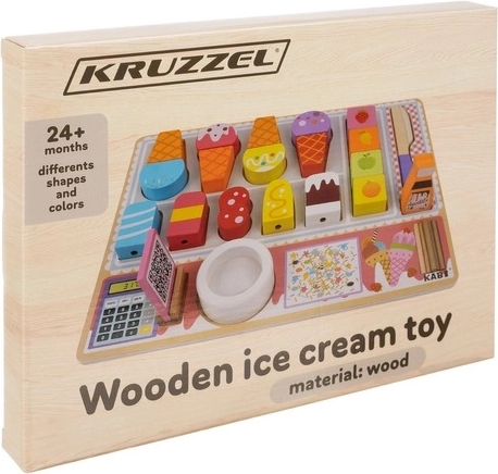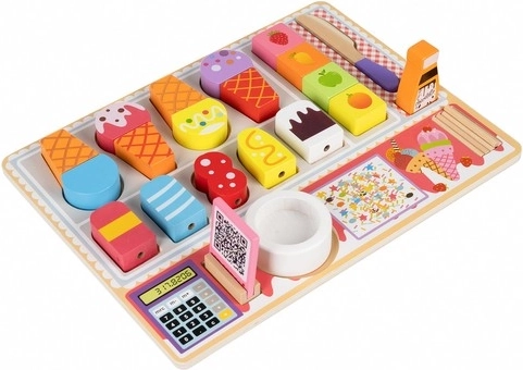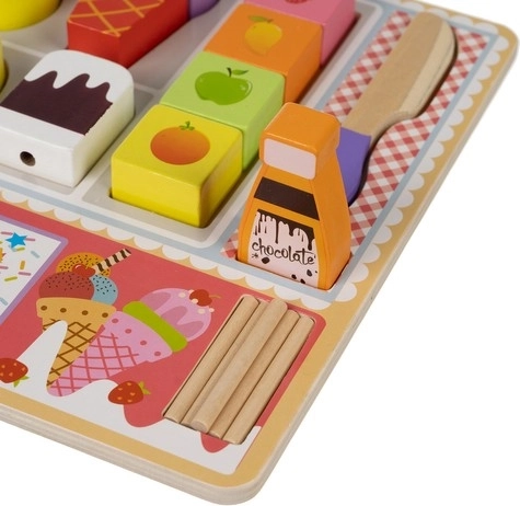 Šis stilīgais koka saldējuma kiosks bērniem sniedz autentisku saldumu veikala noskaņu. Pateicoties košajām krāsām un daudzajām saldējuma kombinācijām, bērni mācās atpazīt krāsas, formas un izmērus un dabiski attīsta kognitīvās un sensorās prasmes. Koka elementi ērti iegulst mazajās rociņās un veicina pareizu satvērienu un pacietību, veidojot bumbiņas un saldējumus uz kociņa.