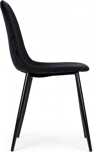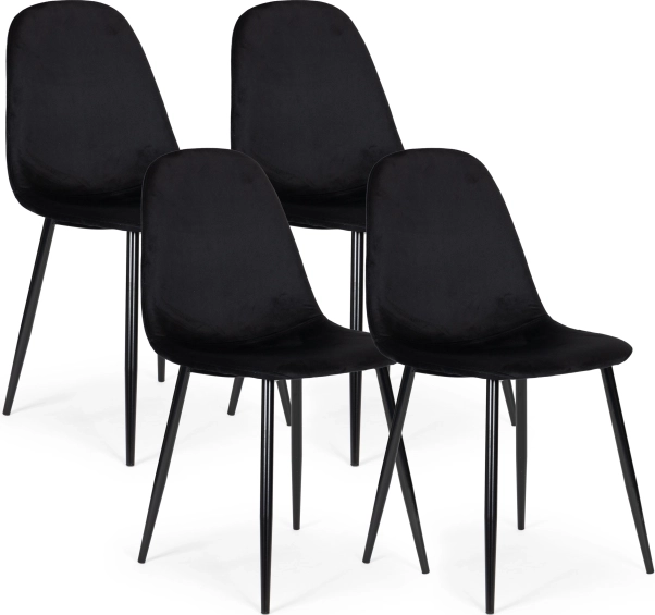 Stilīgs četru krēslu komplekts izceļas ar mūsdienīgu dizainu, samta apšuvumu un metāla kājām ilgmūžībai. Nodrošina augstu sēdēšanas komfortu pateicoties kvalitatīvām putām un veidotu atzveltni. Aizsarguzgaļi sargā grīdu, universālais melnais izpildījums iederas ēdamistabā, viesistabā un birojā.
