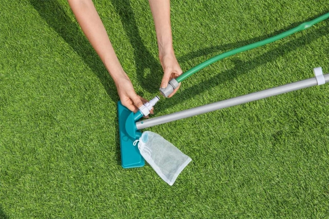 Komplektā iekļauti tādi komponenti kā putekļsūcējs un tīkliņš efektīvai netīrumu noņemšanai no baseina.