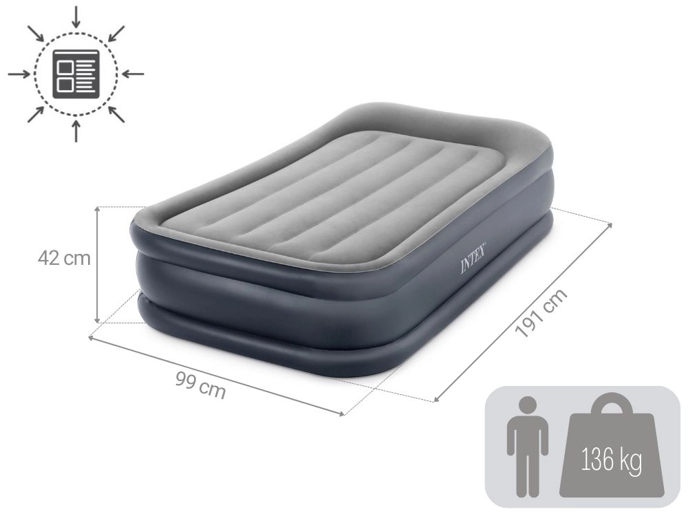 Meklējat ērtu un stabilu papildu gultu viesiem, vasarnīcai vai ceļošanai? INTEX vienvietīgais uzpūšamais matracis ar 42 cm augstumu nodrošina komfortu, kas pielīdzināms klasiskai gultai. Velūra virsma ir patīkama pieskārienam un novērš palaga slīdēšanu, savukārt iebūvētā elektriskā pumpe (220–240 V) nodrošina ātru sagatavošanu miegam.