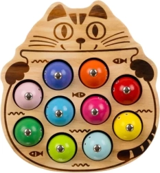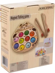 Komplektā ietilpst kaķīša formas koka pamatne, 10 magnētiskas zivtiņas un 2 magnētiskas makšķeres.