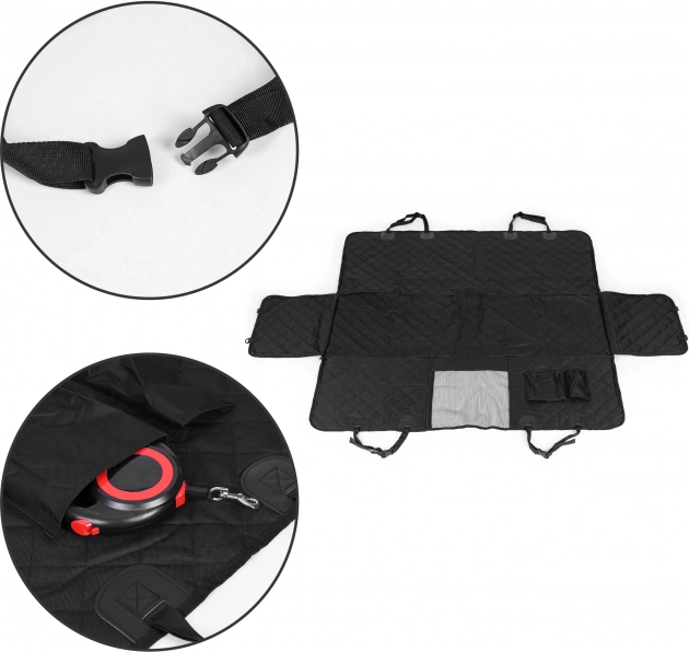 Stepēts, izturīgs pārvalks sedz visu aizmugurējo soliņu un aizsargā apdari no spalvām, dubļiem un skrāpējumiem. Divas kabatas nodrošina, ka pavada, gardumi un sīkas lietas vienmēr ir pa rokai.