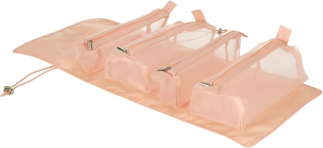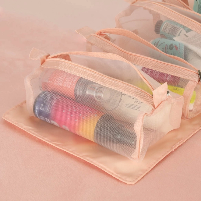 Šī rozā kosmētikas soma ir paredzēta tiem, kuri vēlas ērtību un efektivitāti, organizējot savus kosmētikas produktus ceļojumā. Soma ir aprīkota ar četrām caurspīdīgām rāvējslēdzēja kabatām, kas nodrošina ērtu piekļuvi un satura pārskatāmību. Nodalījumi ir pilnībā noņemami, kas sniedz plašas lietošanas iespējas.