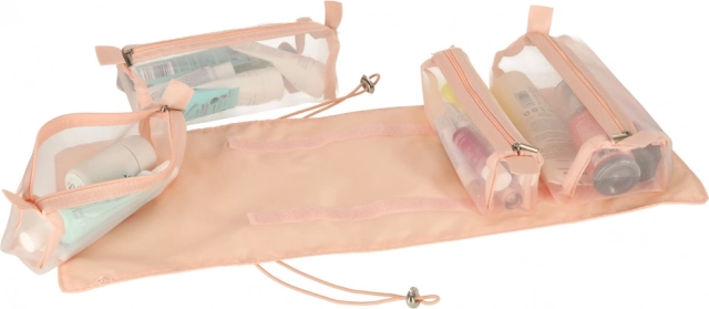 Četras noņemamas rāvējslēdzēja kabatas ir izgatavotas no caurspīdīga materiāla, kas nodrošina vieglu pārskatāmību un jūsu kosmētikas organizēšanu. Noņemamie nodalījumi piešķir lietošanai lielāku elastību.