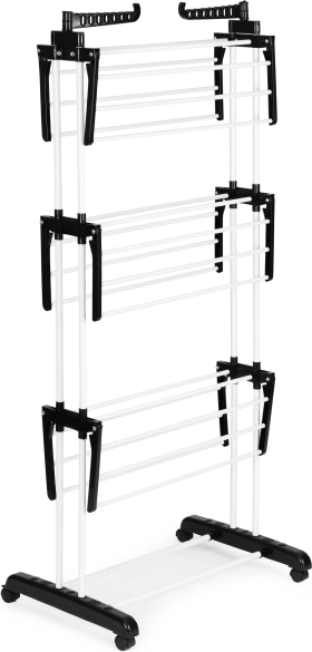 Trīs līmeņi ar 6 nolokāmiem elkoņiem un 2 pakaramo turētājiem vienlaikus ietilpina lielu veļas daudzumu, neaizņemot daudz vietas telpā.