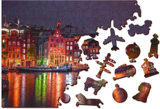 Šī unikālā koka puzle iepriecinās ikvienu salikšanas cienītāju. Pateicoties lāzergriezumam, puzles gabaliņiem ir gludas malas, kas viegli savienojas. Komplektā kopā 150 gabaliņi, no kuriem 30 ir unikālu formu, piemēram, dzīvnieki vai slavenas ēkas, piešķirot gan izglītojošu aspektu, gan vizuālu estētiku. Puzle ir veidota kā 2v1, tas nozīmē, ka to var salikt gan pēc izsmalcinātā Amsterdamas nakts motīva, gan pēc formas, vadoties pēc raksta aizmugurē.