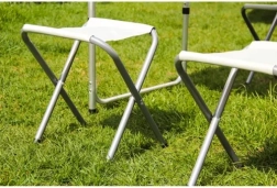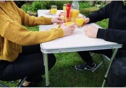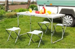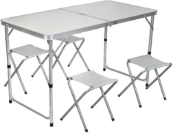 Šis universālais kempinga komplekts apvieno stabilu galdu ar regulējamu augstumu un četrus izturīgus saliekamos krēsliņus. Pateicoties kofera sistēmai, visu komplektu ir ērti pārnēsāt un uzglabāt – salocīts galds ietilpina visus krēsliņus iekšpusē, bet drošības aizdares novērš nejaušu atvēršanos pārvadāšanas laikā.