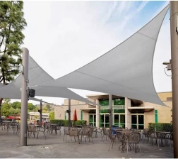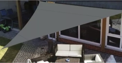 Trīsstūrveida forma 4 × 4 × 4 m veido patīkamu ēnu virs terases vai dārza sēdvietas. Materiāls samazina pārkaršanu un ļauj gaisam cirkulēt.