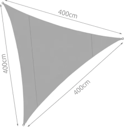 Praktiska trīsstūrveida noēnošanas sega 4 × 4 × 4 m pelēkā krāsā no zīmola Gardlov nodrošina uzticamu aizsardzību no saules un viegla lietus. Pateicoties kvalitatīvam audumam ar blīvumu 120 g/m² un nerūsējoša tērauda gredzeniem stūros, tā garantē efektīvu noēnojumu, izturību pret mitrumu un pelējumu un vienkāršu uzstādīšanu ar komplektā iekļautajām auklām.