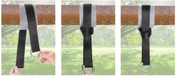 Komplektu var uzstādīt pāris minūtēs – pietiek aptīt siksnas/virves un nostiprināt ar karabīnēm. Nekādi instrumenti, nekādu virsmu bojājumu.