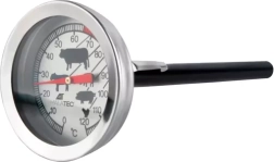 Termometrs satur simbolus optimālajām dažādu gaļas veidu temperatūrām un viegli nolasāmu ciparnīcu.