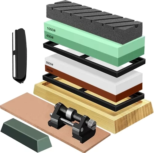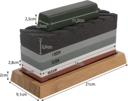 - 4 slīpēšanas akmeņi (400/1000/3000/8000), 2 gumijas paklājiņi, bambusa pamatne ar pretbuksēšanu, ādas siksna un pamatne pulēšanai, pulēšanas pasta, vadotne kaltiem/nažiem, asmens vadotne, izlīdzināšanas akmens, krāsaina kaste, transporta kartons