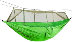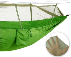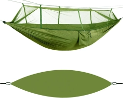 - Guļamtīkls ar moskītu tīklu, 4× aukla, karabīnes, integrēts apvalks/kabata
