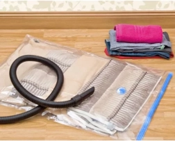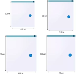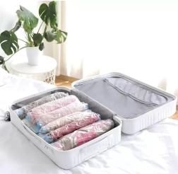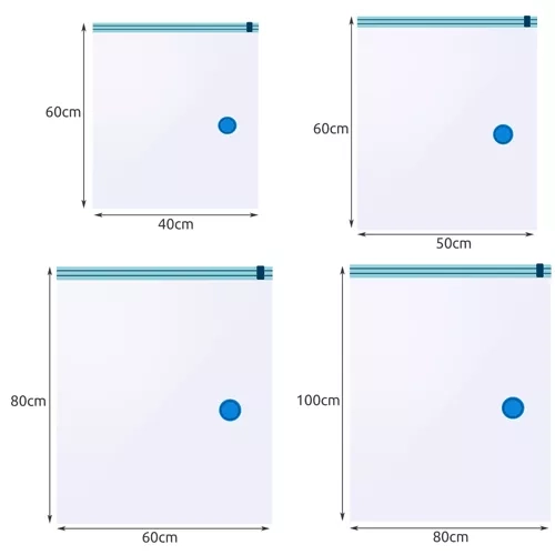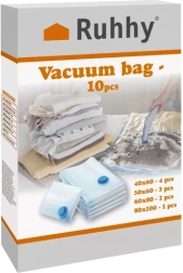 Ietaupiet vietu mājās un ceļā ar vakuuma maisiņu komplektu: 10 gabali 4 praktiskos izmēros. Pēc gaisa atsūkšanas ar parastu putekļsūcēju tekstilizstrādājumu tilpums samazinās līdz pat 80 %. Saturs ir droši pasargāts no putekļiem, mitruma, ūdens un kožu, un apģērbs paliek tīrs un patīkami svaigs. Ideāli sezonālajam apģērbam, segām un pārklājiem un arī ceļojuma čemodāna organizēšanai.