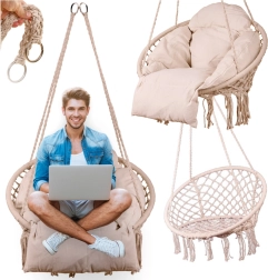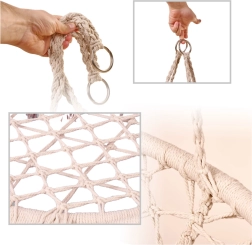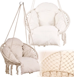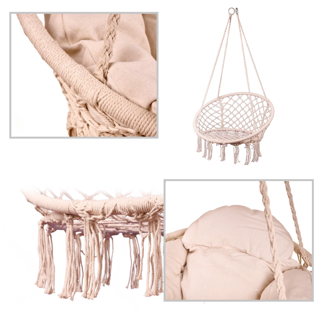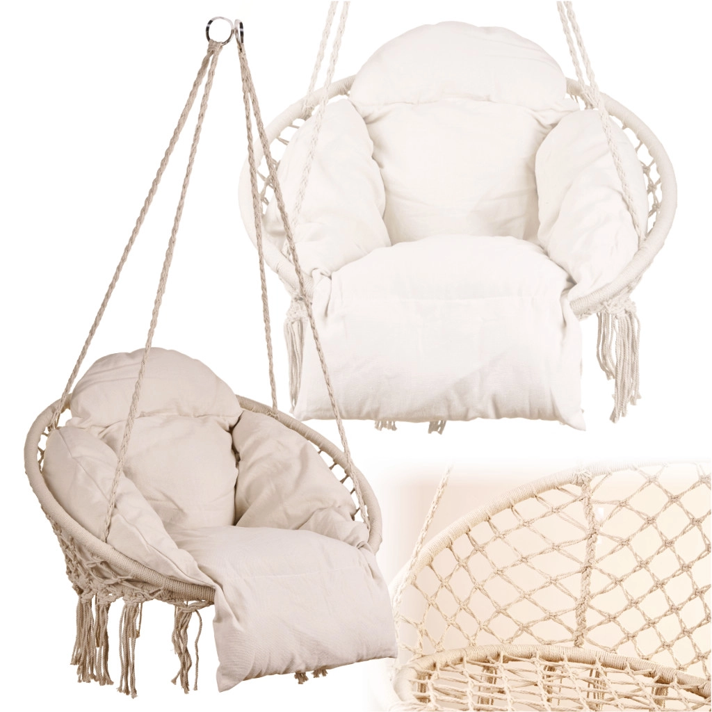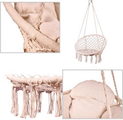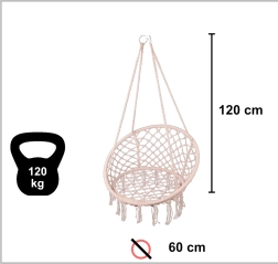 Šis pakaramais šūpuļkrēsls nodrošina ērtu sēdēšanu mierīgai atpūtai un vieglai šūpošanai. Lielā apaļā forma un mīkstais spilvens veicina ergonomisku ķermeņa pozīciju, savukārt izturīgie kokvilnas virvju pinumi un metāla rāmis sniedz drošību un ilgmūžību.