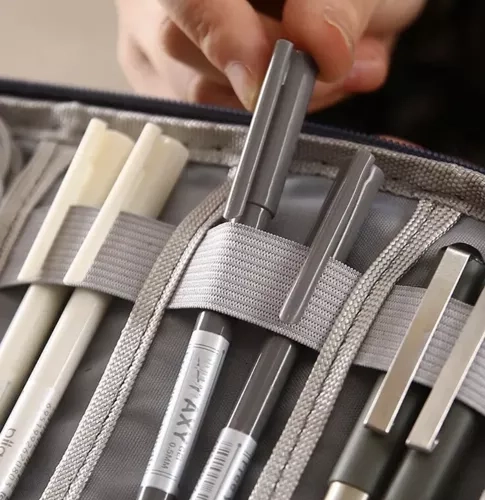 Iekšpusē atradīsiet 6 tīklveida kabatas ātram pārskatam un 8 elastīgas gumijas cilpas drošai piederumu fiksācijai. Rāvējslēdzēja aizdare sargā saturu, putu polsterējums amortizē triecienus, bet rokas siksniņa atvieglo pārnēsāšanu. Piemērots darbam, mācībām un ceļošanai.