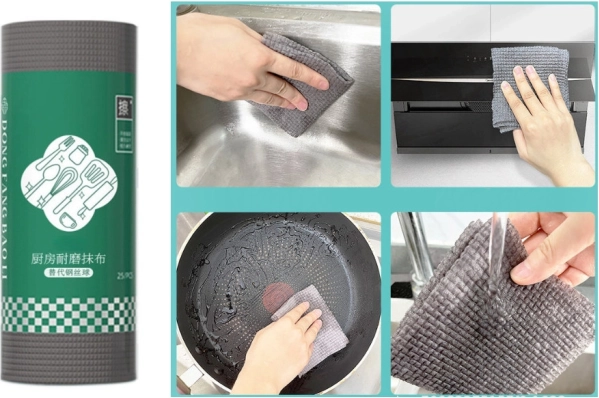 Praktisks komplekts ikdienas uzkopšanai: pelēki virtuves dvieļi un sūkļi rullī ar izmēru 20 × 9 cm, iepakojumā 25 gabali. Ideāli ātrai noslaucīšanai, tīrīšanai un pulēšanai virtuvē un mājoklī. Pateicoties kompaktajam iepakojumam, vienmēr pa rokai un viegli atplēšami. Absorbējošs materiāls, universāls pielietojums un ekonomisks iepakojums bezrūpīgai tīrībai.