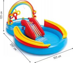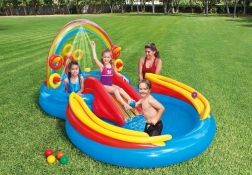 Uzpūšamais ūdens rotaļu laukums Intex apvieno seklu baseinu, slidkalniņu un interaktīvus elementus vienā košā izklaides centrā. Varavīksnes loks ar izsmidzināšanu veido atsvaidzinošu ūdens aizkaru, pa kuru bērni droši noslīd uz mīksta piezemēšanās paliktņa. Divas ūdens zonas ar atšķirīgu dziļumu ir ideālas dažādām vecuma grupām.