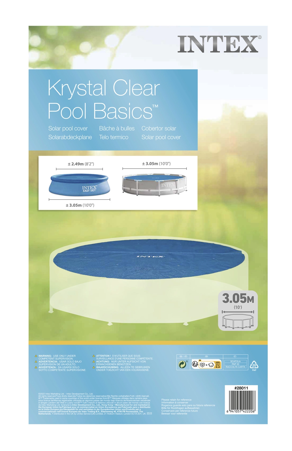 Praktiskais INTEX saules pārklājs apaļiem baseiniem ar 305 cm diametru efektīvi sasilda un uztur ūdens temperatūru, vienlaikus samazinot siltuma zudumus naktī un aizsargājot ūdens virsmu no lapām un netīrumiem. Pateicoties burbuļplēves struktūrai, tas laiž cauri saules starus un uzlabo ūdens izolāciju.