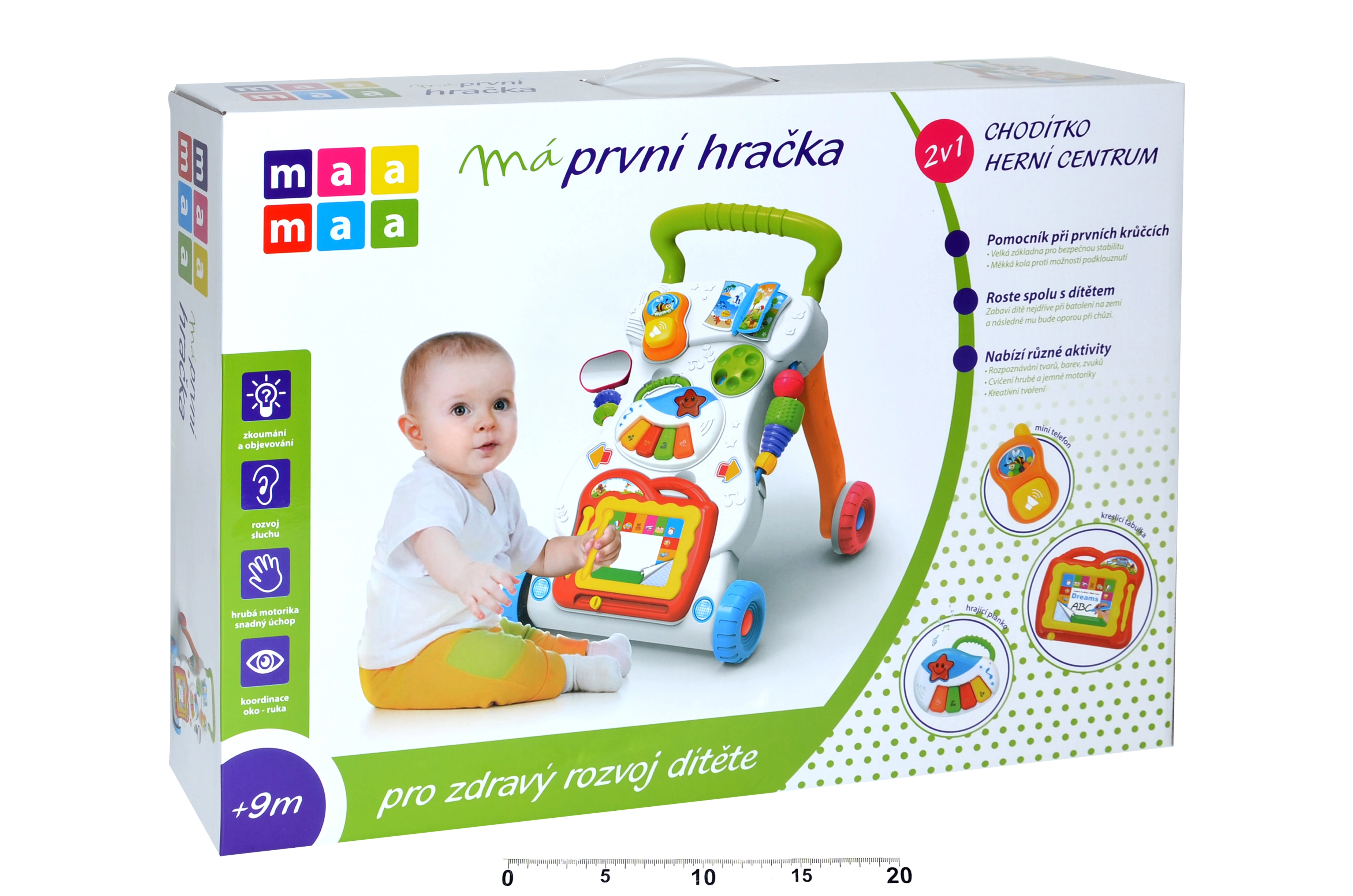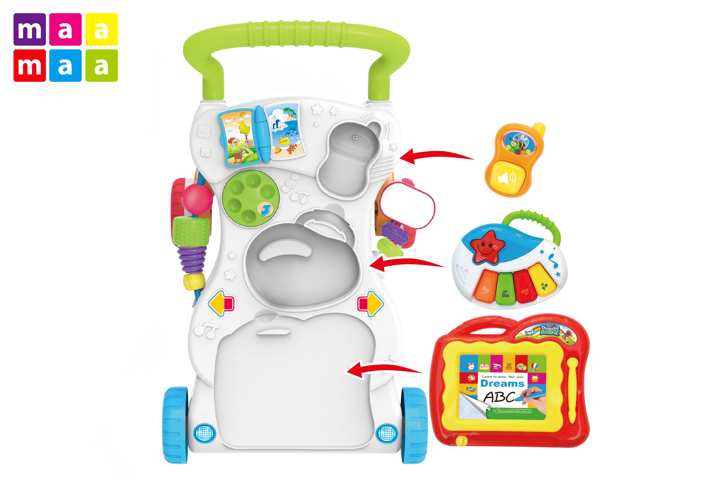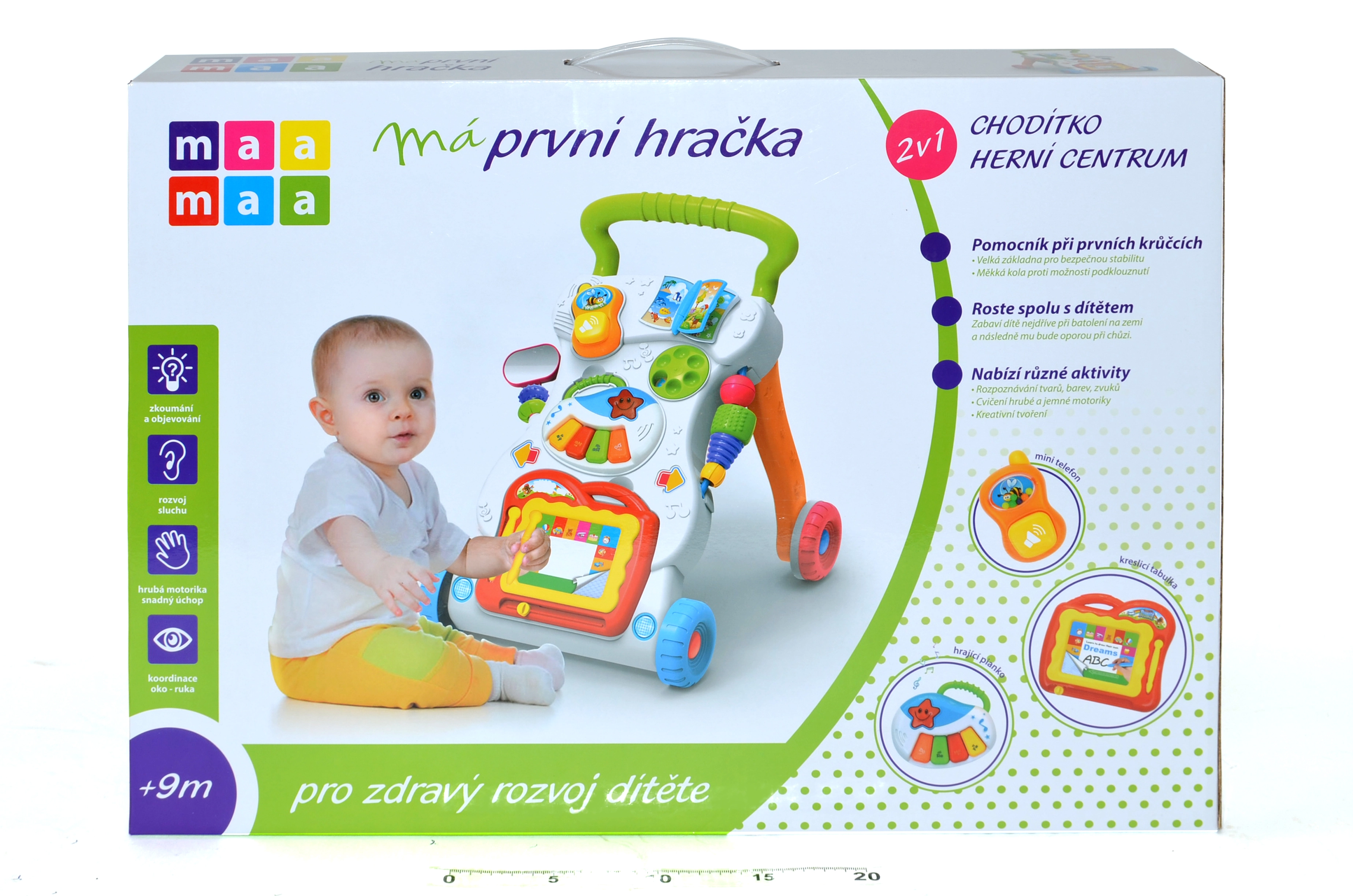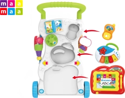 Interaktīvais staigulis un rotaļu centrs 2 vienā no zīmola MaaMaa atbalsta pirmos soļus un daudzpusīgu bērna attīstību. Pateicoties platai, stabilai pamatnei, pretizslīdes ritenīšiem un daudzveidīgām aktivitātēm – no krāsu, formu un ciparu apgūšanas līdz pat zīmēšanai, spēlēšanai uz klavierītēm un “tālrunim” – jūsu mazulis izklaidēsies un attīstīs motoriku, iztēli un maņas.