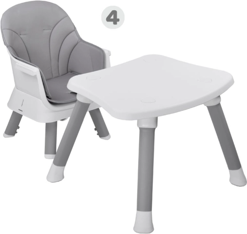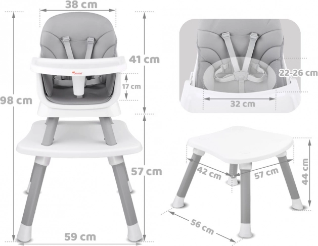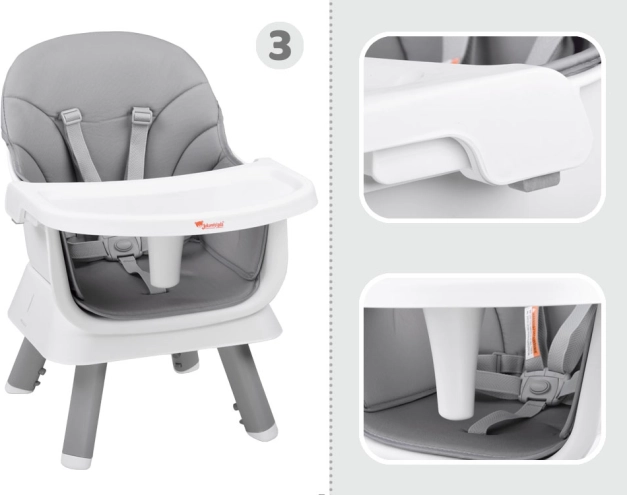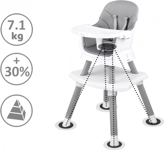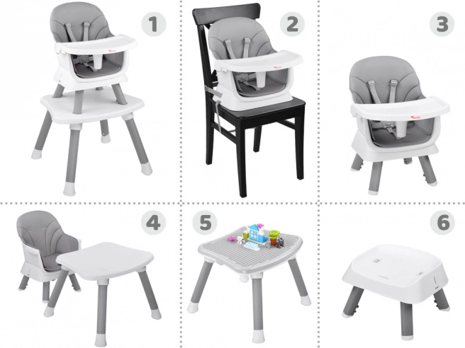 Praktisks bērnu barošanas krēsliņš 6 vienā aug līdzi jūsu bērnam no 6 mēnešu vecuma. Piedāvā modulāru konstrukciju, drošas 5 punktu siksnas, viegli tīrāmu un elpojošu pārvalka audumu, noņemamu paplāti un pretbuksēšanas kājiņas. Pateicoties dažādām konfigurācijām, tas kalpo kā augsts un zems krēsliņš, uzliktnis uz ēdamkrēsla, atsevišķs krēsliņš ar galdiņu un spēļu galds klucīšiem.