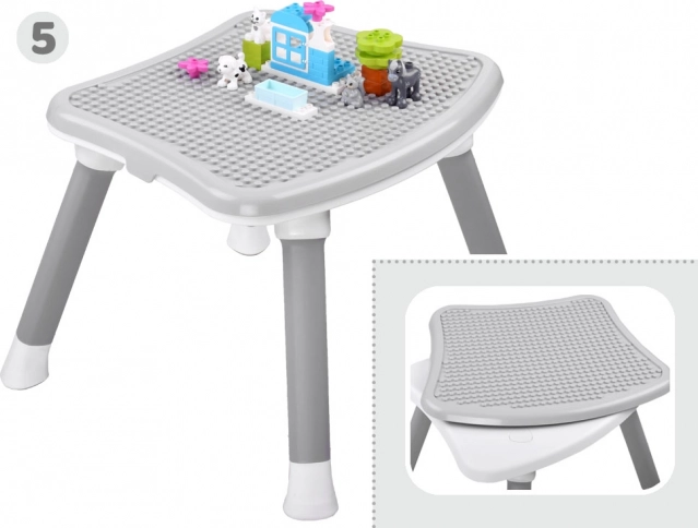 Komplektā ietilpst galds ar virsmu klucīšu būvēšanai – ideāli piemērots krāsošanai, zīmēšanai un fantāzijas konstrukciju veidošanai.