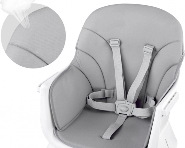 Ergonomisks sēdeklis, elpojošs un viegli tīrāms pārvalks, 5 punktu siksnas un pretizslīdēšanas barjera. Pretbuksēšanas kājiņas nodrošina stabilitāti uz jebkuras virsmas.