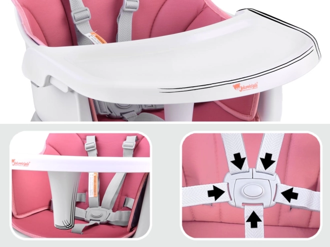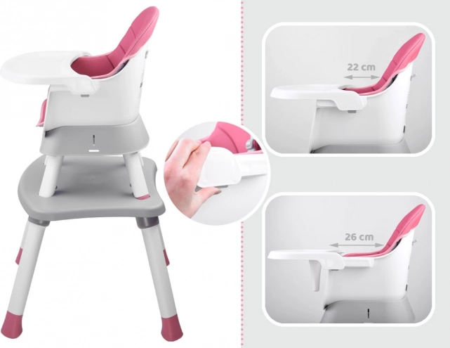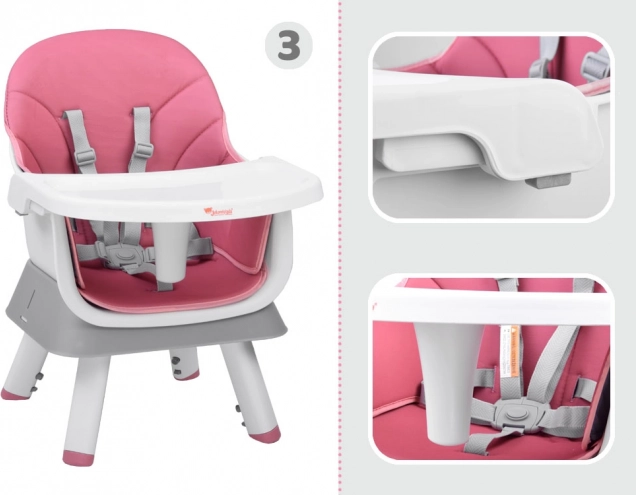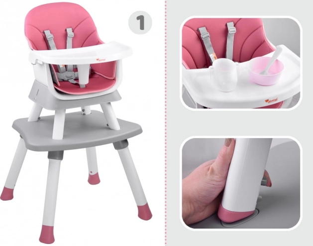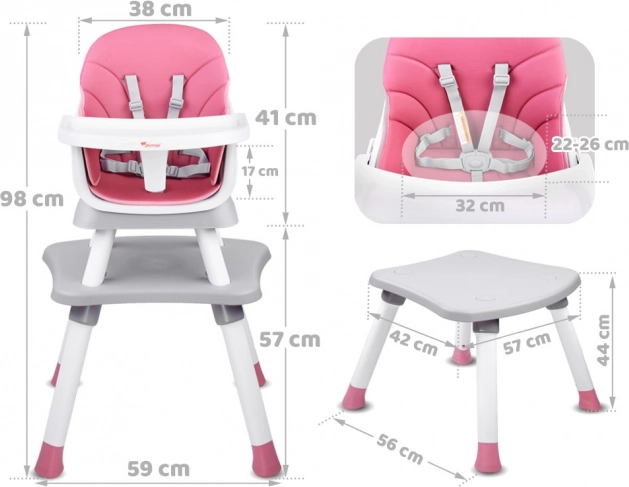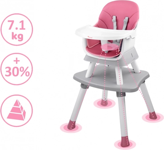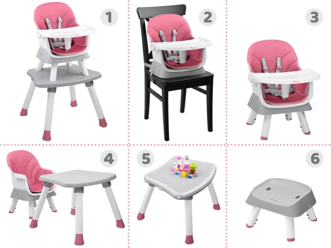 Multifunkcionāls bērnu barošanas krēsliņš 6‑vienā bērniem no 6 mēnešiem aug kopā ar jūsu mazuli. Piedāvā augstu un zemu sēdēšanu, uzliktni uz ēdamkrēsla, spēļu galdiņu un tabureti. Tam ir 5 punktu drošības jostas, noņemams un viegli tīrāms paplātes galdiņš, pretbuksēšanas kājiņas un viegli kopjama elpojoša pārvalka auduma apdare.