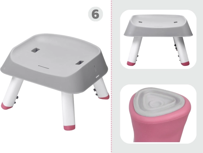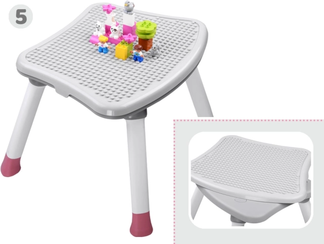 - 6 funkcijas 1 ierīcē: augstais krēsliņš ar paplāti, uzliktne uz ēdamkrēsla, zemais krēsliņš ar paplāti, krēsliņš + galdiņš, galdiņš ar kluču virsmu, zema taburete