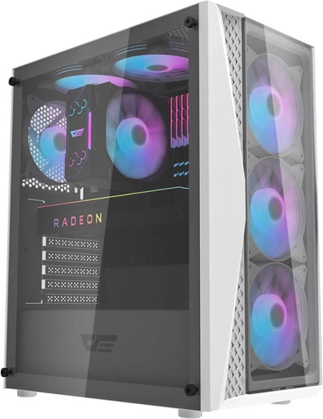 Sānu panelis un priekšpuse no rūdīta stikla izceļ komponentes un ARGB efektus. Elegants balts korpuss lieliski iederas gan spēļu, gan biroja komplektācijās.