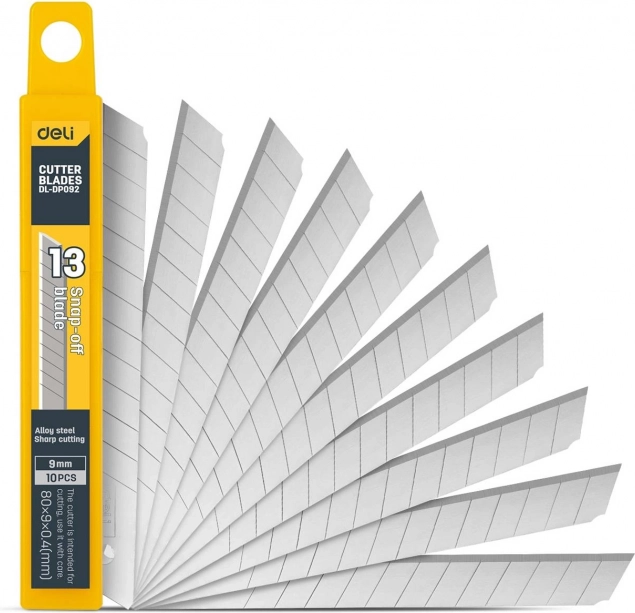 Universāls Deli Tools nazis ar 9 mm asmeni ir ideāli piemērots precīzai griešanai un praktiski izmantojams dažādās situācijās. Komplektā iekļauti 10 rezerves asmeņi ilgtermiņa lietošanai.