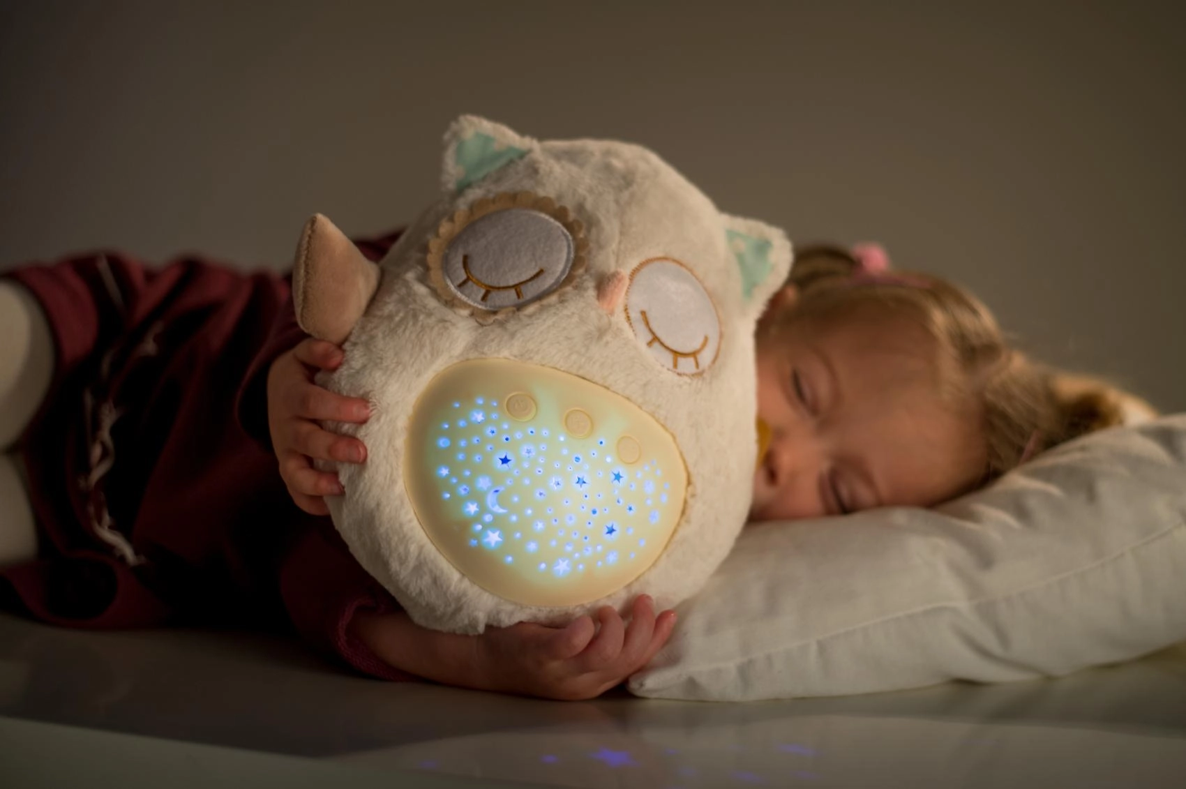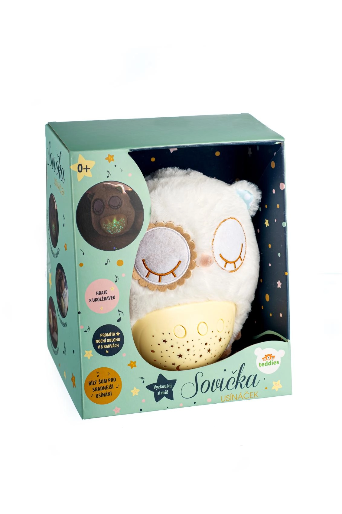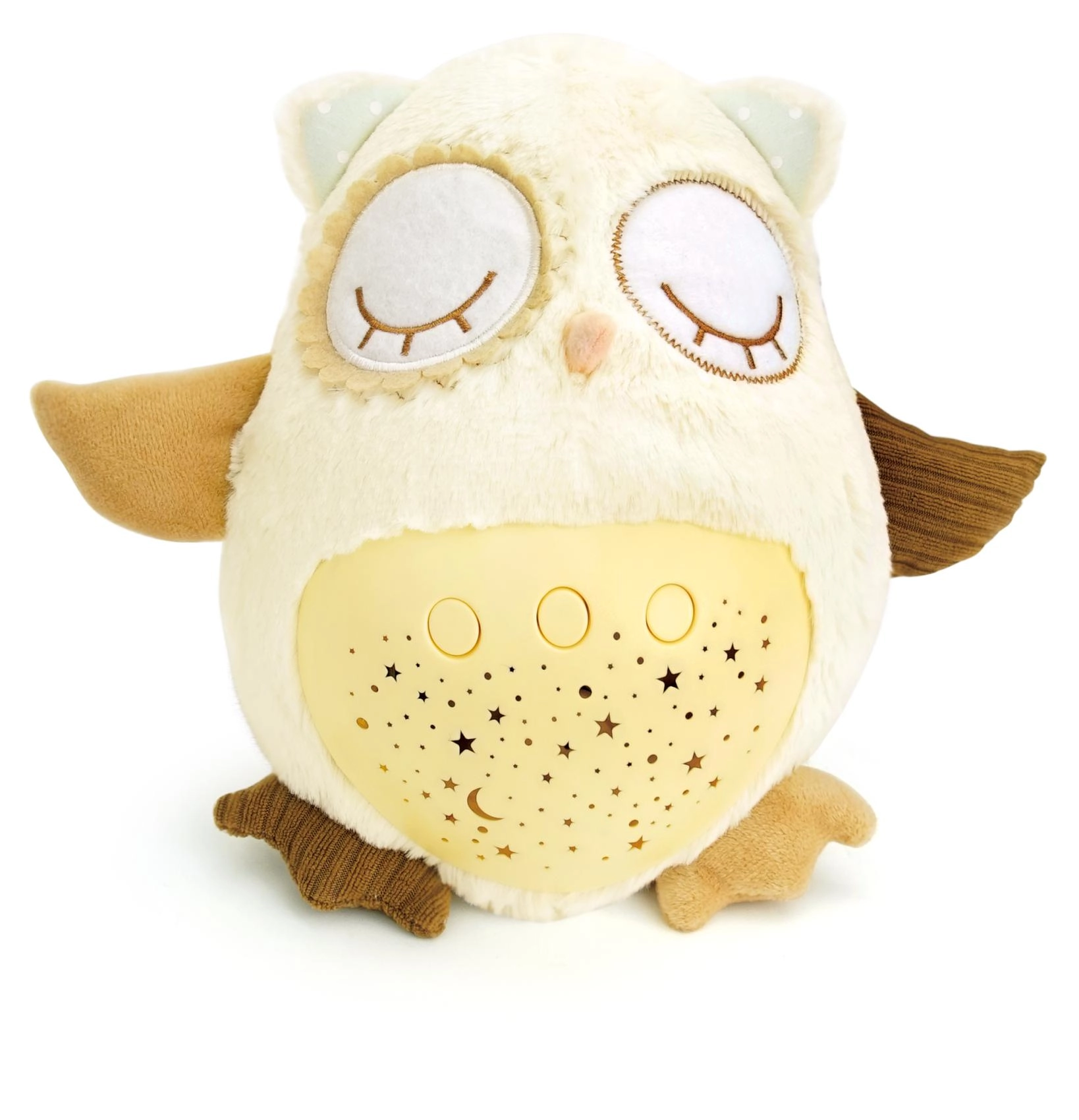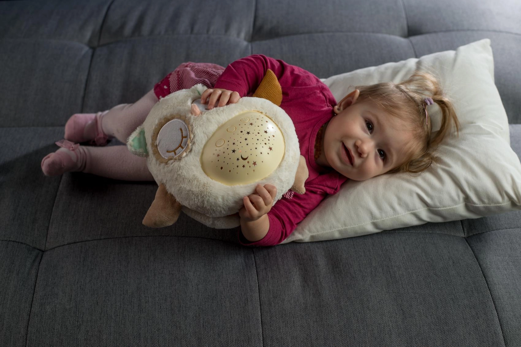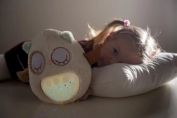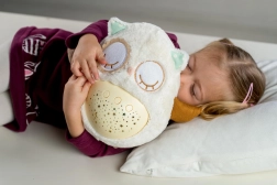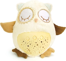 Šis mīkstais, pūkainais aizmigšanas draudziņš apvieno siltu apkampienu ar gudrām iemidzināšanas funkcijām. Pūcīte projicē zvaigžņotas debesis 8 krāsās, atskaņo 8 šūpuļdziesmas un nomierinošas prenatālās skaņas, pie kurām paši mazākie ir raduši mammas vēderī. Pēc melodijas nospēlēšanas tā vēl aptuveni minūti maigi spīd un pēc tam automātiski izslēdzas.