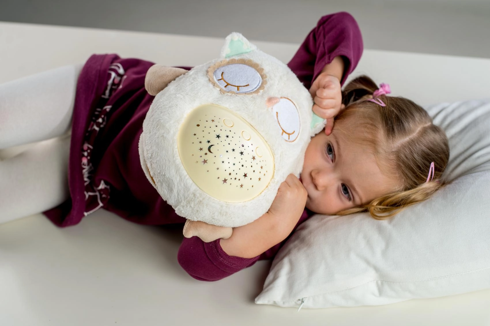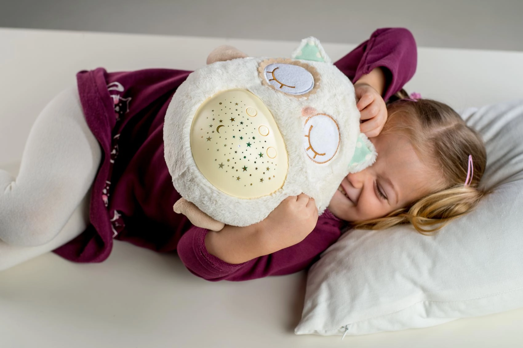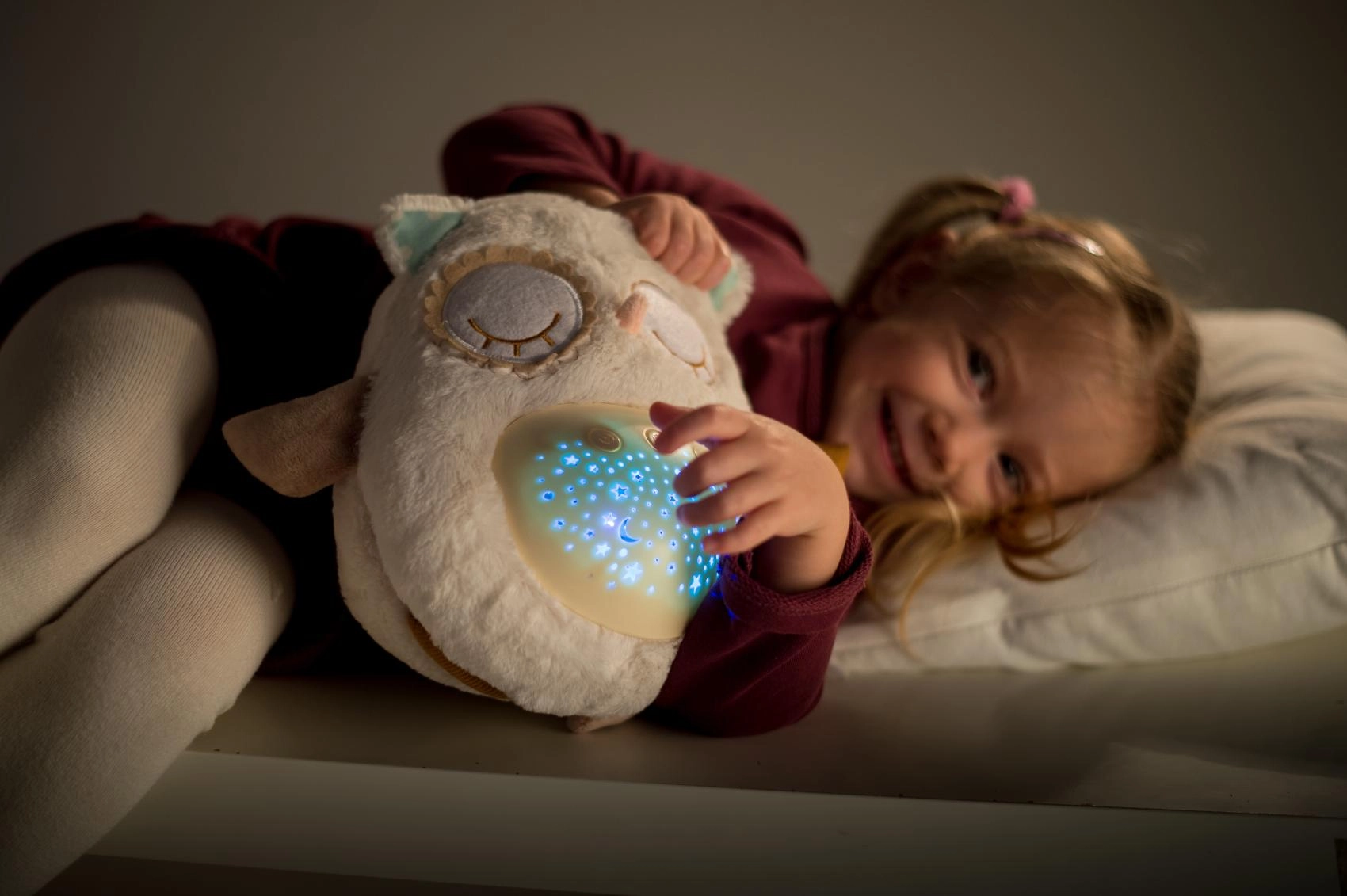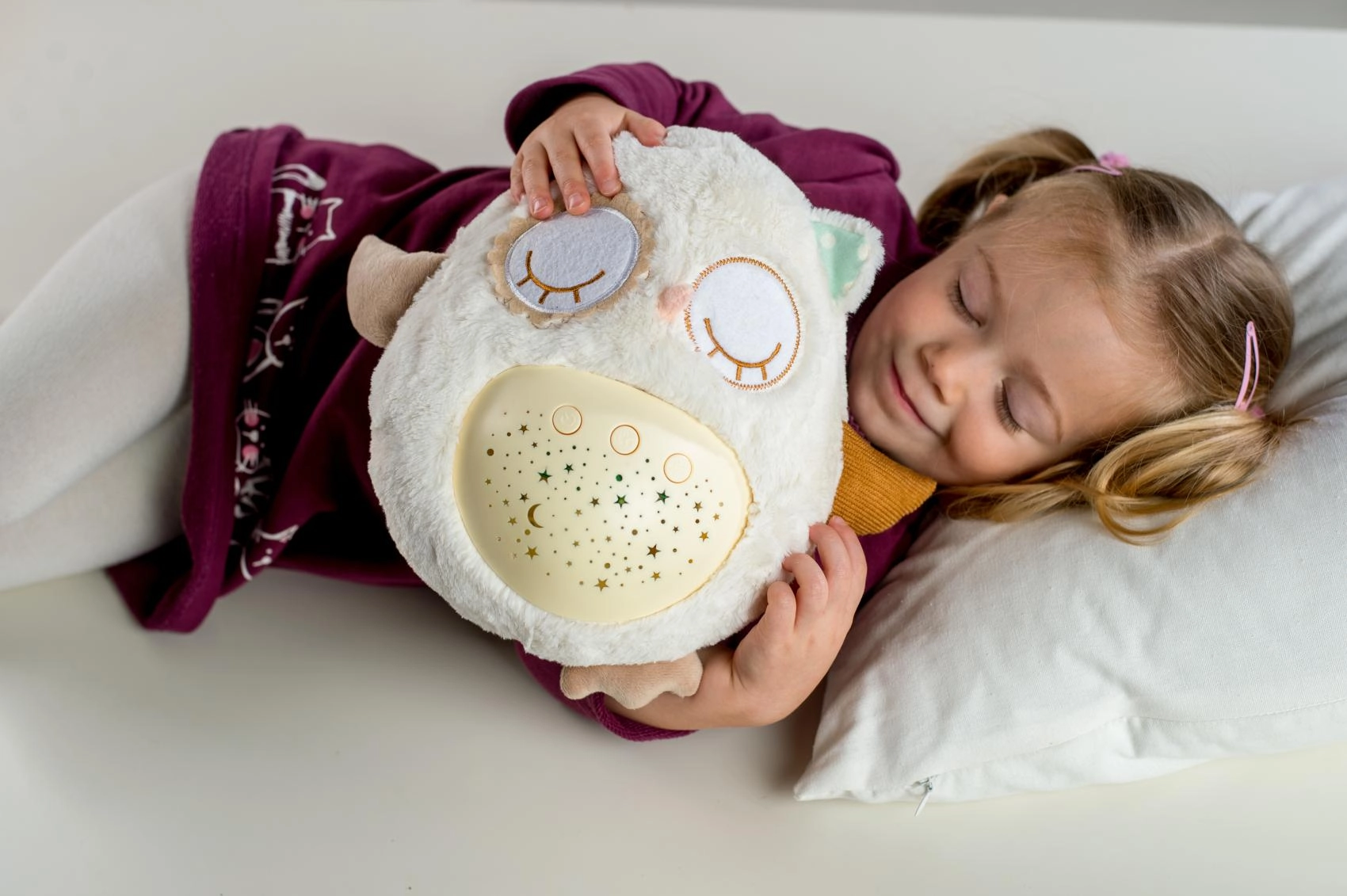 Šis mīkstais, pūkainais aizmigšanas draudziņš apvieno siltu apkampienu ar gudrām iemidzināšanas funkcijām. Pūcīte projicē zvaigžņotas debesis 8 krāsās, atskaņo 8 šūpuļdziesmas un nomierinošas prenatālās skaņas, pie kurām paši mazākie ir raduši mammas vēderī. Pēc melodijas nospēlēšanas tā vēl aptuveni minūti maigi spīd un pēc tam automātiski izslēdzas.