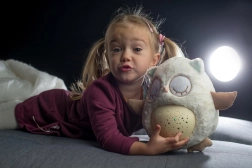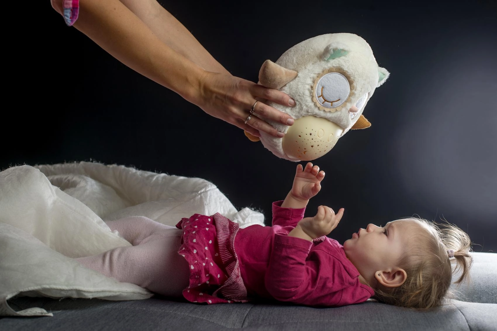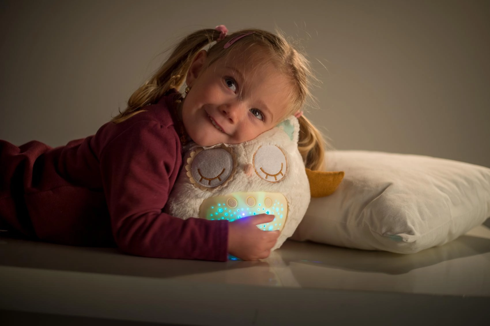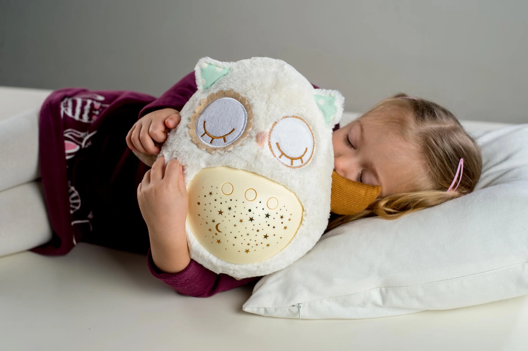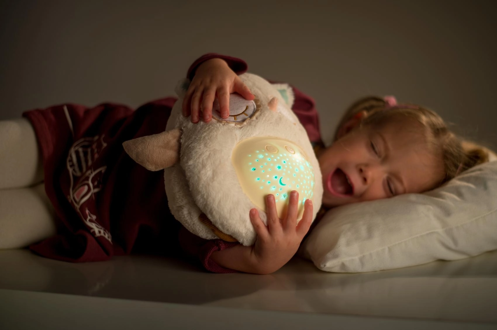 Šis mīkstais, pūkainais aizmigšanas draudziņš apvieno siltu apkampienu ar gudrām iemidzināšanas funkcijām. Pūcīte projicē zvaigžņotas debesis 8 krāsās, atskaņo 8 šūpuļdziesmas un nomierinošas prenatālās skaņas, pie kurām paši mazākie ir raduši mammas vēderī. Pēc melodijas nospēlēšanas tā vēl aptuveni minūti maigi spīd un pēc tam automātiski izslēdzas.