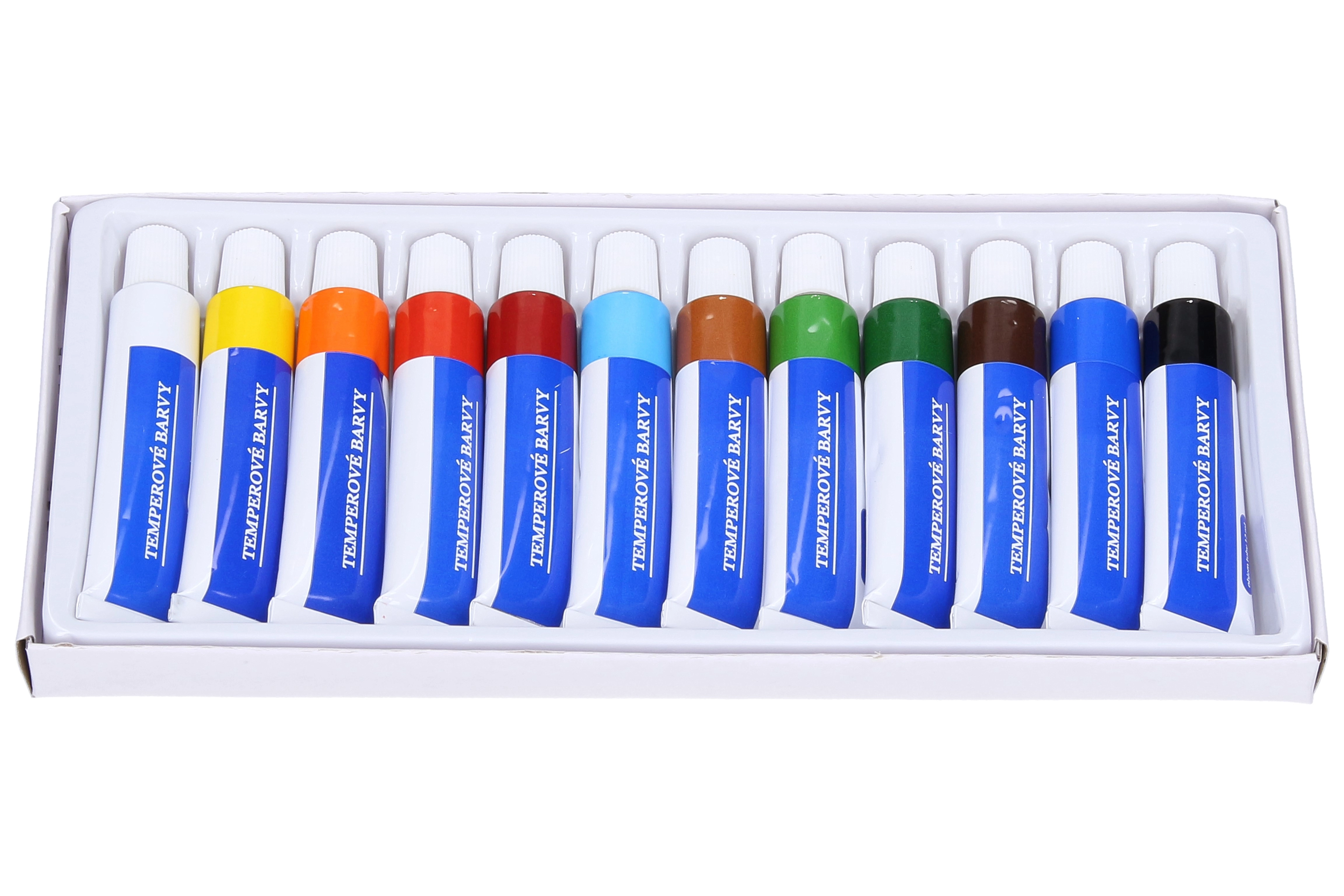 Kvalitatīvas tempera krāsas metāla komplektā skolai, hobijiem un māksliniekiem. Krāsas viegli uzklājas, lieliski sedz, ir gaismnoturīgas un šķaidāmas ar ūdeni. Pateicoties skrūvējamiem vāciņiem tās neizžūst, un pēc nožūšanas tās var atkal sajaukt ar ūdeni.