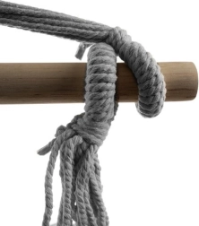 Koka šķērslata vienmērīgi sadala slodzi, tāpēc krēsls ir labi līdzsvarots un stabils. Izturīgā iekarināšanas virve ar montāžas gredzenu nodrošina vienkāršu uzstādīšanu un drošu lietošanu. Komplektā ietilpst 2 spilveni 40 × 40 cm, kas palielina sēdēšanas komfortu.