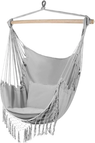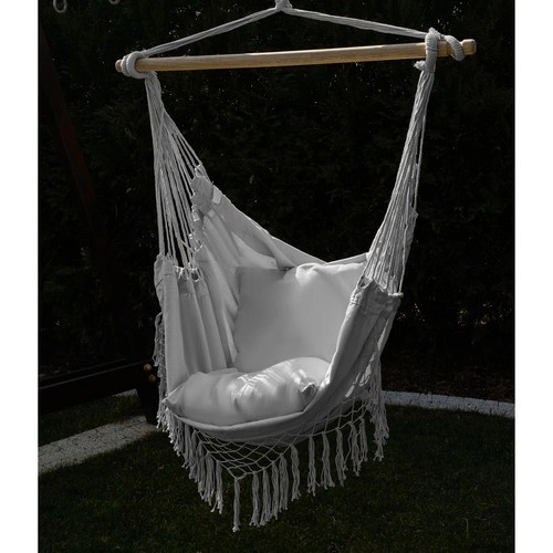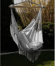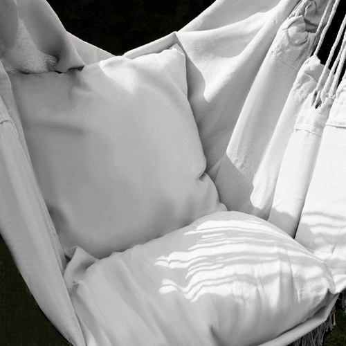 Šis ērtais karājamais krēsls hamakas stilā ir paredzēts ikdienas atpūtai – no īsas diendusas līdz iecienītas grāmatas lasīšanai. Dabīgā kokvilna ar poliestera piejaukumu ir patīkama pieskārienam, labi ventilējas un vienlaikus saglabā augstu nodilumizturību.