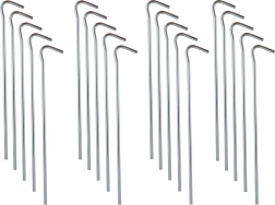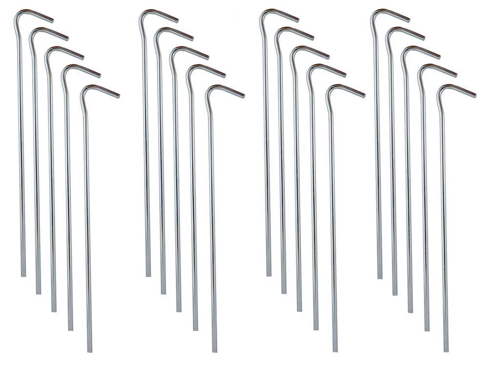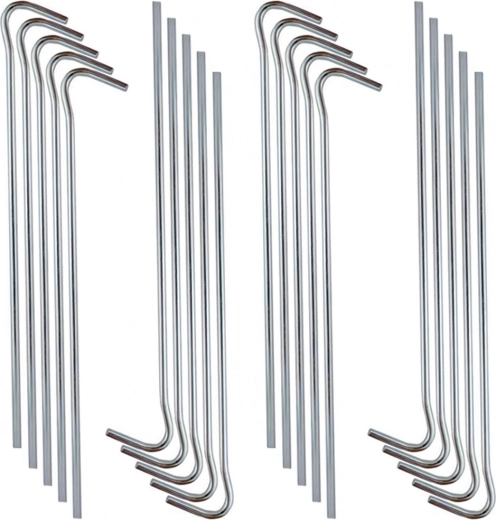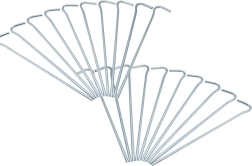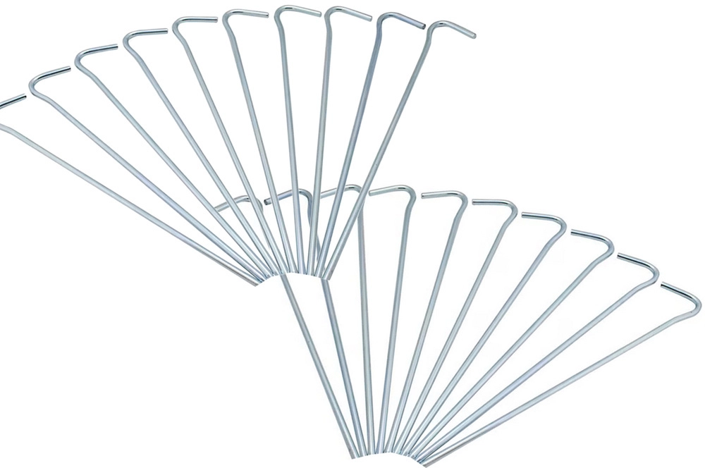 Šis praktiskais 20 gabalu komplekts ietver kvalitatīva tērauda mietiņus ar 3 mm diametru un 18 cm garumu. Tie nodrošina stabilu nostiprinājumu tūrisma un pludmales teltīm, dārza paviljoniem, siltumnīcām ar plēvi un citam āra aprīkojumam. Pateicoties formu kombinācijai, tie der dažādu tipu auklām un cilpām.