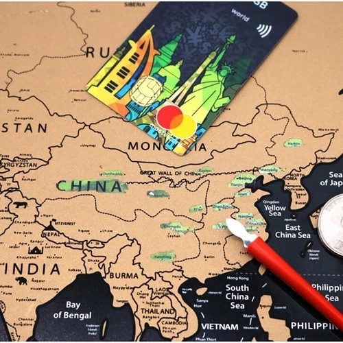 Nokasāma pasaules karte ir ideāli piemērota ceļotājiem, kuri vēlas sekot saviem ceļojumiem un vienlaikus iegūt stilīgu dekoru. Nokasot atklāsiet košus karogus un katras valsts detaļas. Komplektā ir 3 kartes izvietošanas veidi — pie sienas, uz korķa tāfeles vai rāmī.