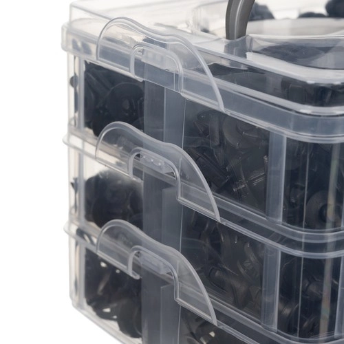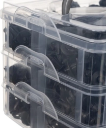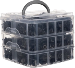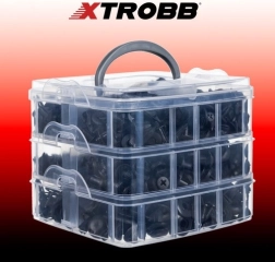 Viss ir pārskatāmi sakārtots kompaktā trīsstāvu kastē ar drošām sprādzēm un pārnēsājamu rokturi. Atdalītās nodalījumu sekcijas ietaupa laiku pareizā tipa meklēšanā. Saudzīgai apšuvumu demontāžai komplektā ir 4 plastmasas izvirzītāji un metāla izvilcējs ar ergonomisku satvērienu, kas samazina detaļu bojājumu risku.