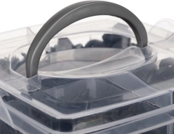 Praktiska kaste ar caurspīdīgiem stāviem un drošības sprādzēm uztur klipus pārskatāmi un droši. Viegli pārvietojama, pateicoties izturīgam rokturim.