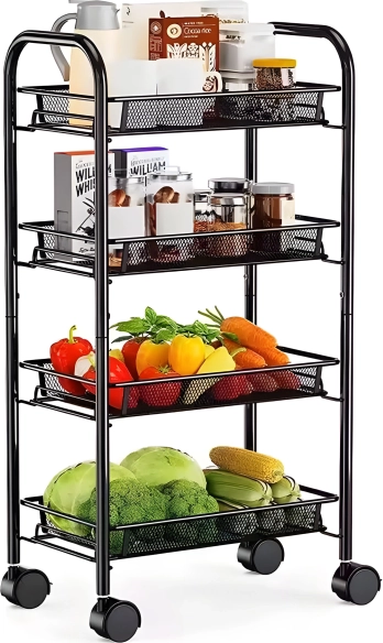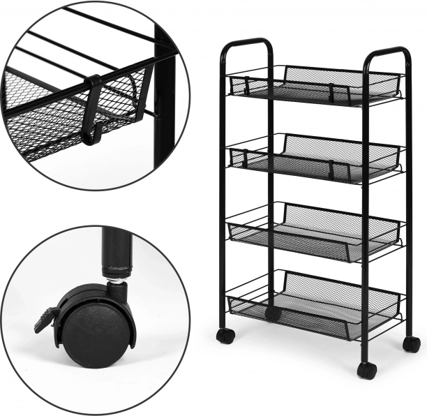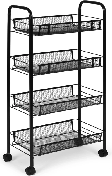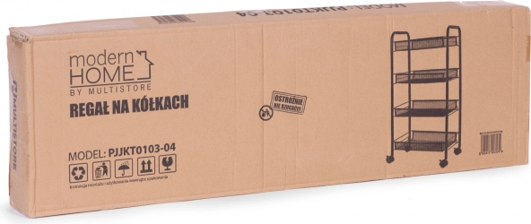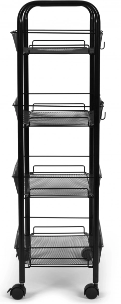 Praktiskais un stilīgais ModernHome plaukts pārvērtīs šauras un neizmantotas vietas par gudru uzglabāšanas risinājumu. Tas piedāvā 4 ietilpīgas grozu plauktu virsmas, stabilu metāla konstrukciju un 4 riteņus (2 ar bremzi) ērtai pārvietošanai. Ideāli piemērots virtuvē, vannas istabā, viesistabā un birojā, ar 4 āķiem sīkumiem un piederumiem.