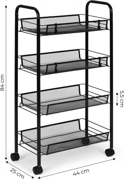 Universālais pārvietojamais plaukts nodrošina pārskatāmu vietu garšvielām, pārtikai, dvieļiem, kosmētikai, grāmatām un rotaļlietām. Atvērtā stiepļu grozu konstrukcija nodrošina lielisku pārredzamību un ventilāciju, savukārt metāla rāmis garantē izturību un ilgmūžību. Pateicoties kompaktajiem izmēriem 84 × 44 × 25 cm, to viegli izmantot šaurās spraugās pie darba virsmas vai skapja.