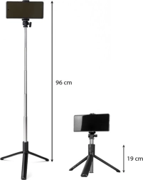 Kompakts 2-in-1 selfiju kāts un statīvs ar noņemamu Bluetooth tālvadības pulti gan Android, gan iOS. Piedāvā teleskopisku pagarinājumu līdz pat 92 cm, 360° griežamu telefona turētāju un stabilu trijkāji selfijiem, grupu fotogrāfijām, video, vlogiem un videozvaniem. Tālvadības slēdzis 10–15 m attālumā nodrošina asus kadrus bez drebēšanas.