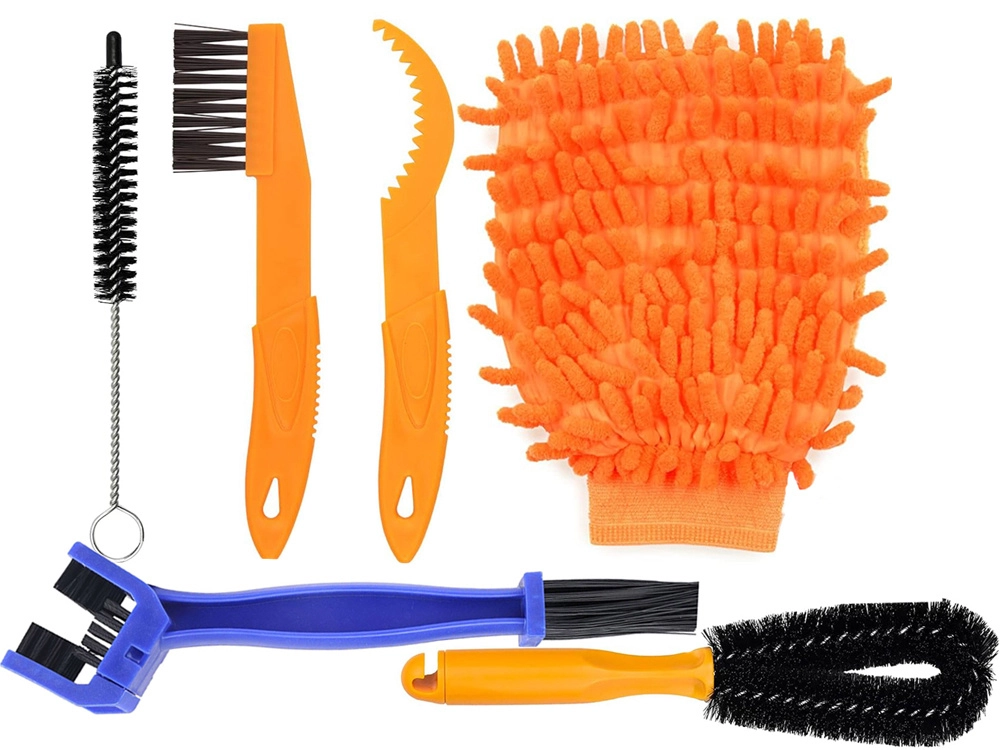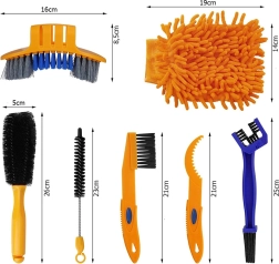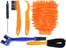 Pilns 7‑in‑1 velosipēda tīrīšanas komplekts ātrai visa velosipēda apkopei. Iekļautas birstes ķēdei, kasetei, riepām un šaurām spraugām, kā arī mikrošķiedras cimds saudzīgai mazgāšanai. Ergonomiski rokturi nodrošina ērtu lietošanu, un materiāli neskrāpē virsmas. Ideāli der pilsētas, kalnu, šosejas un elektrovelosipēdiem.