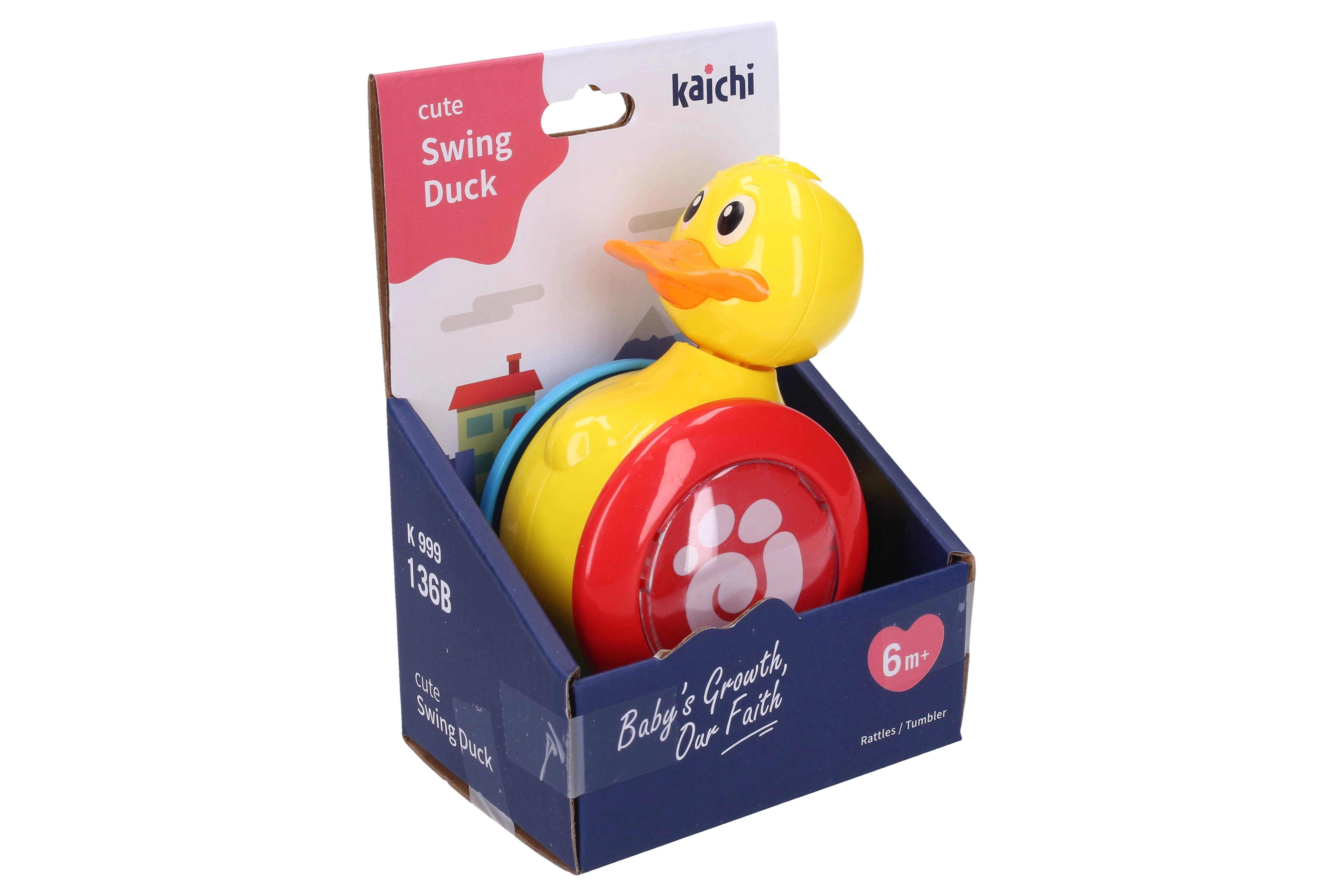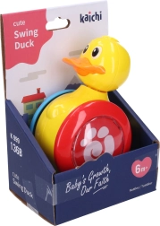 Krāsaina pīle uz riteņiem piesaista bērnu uzmanību ar šūpojošām kustībām un grabējošām skaņām no mazajām lodītēm.