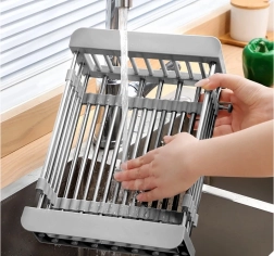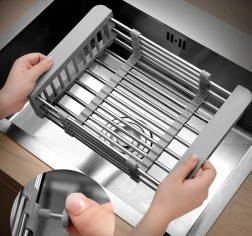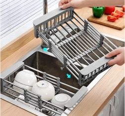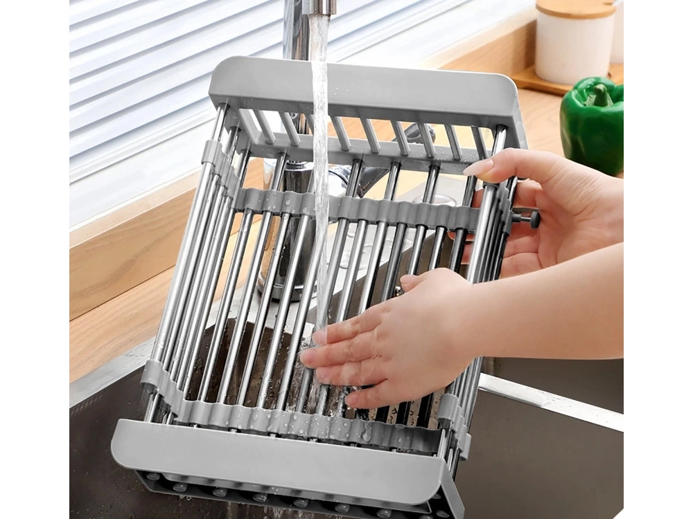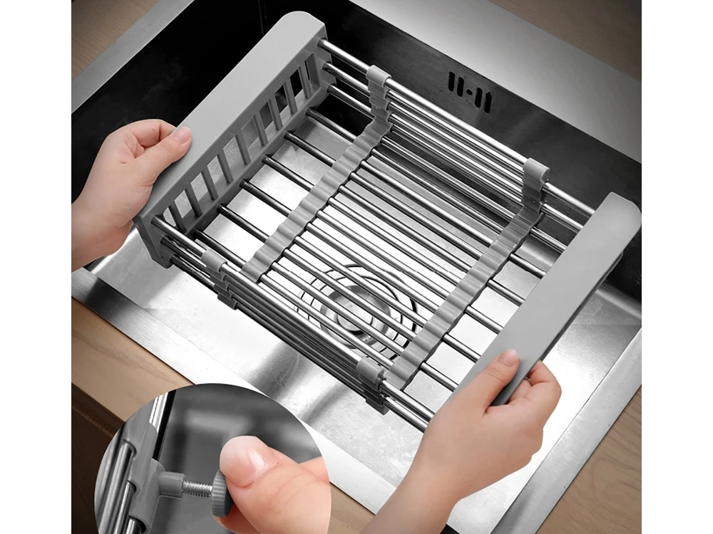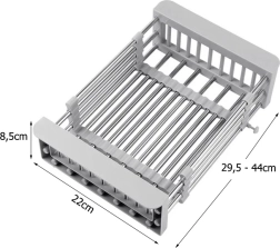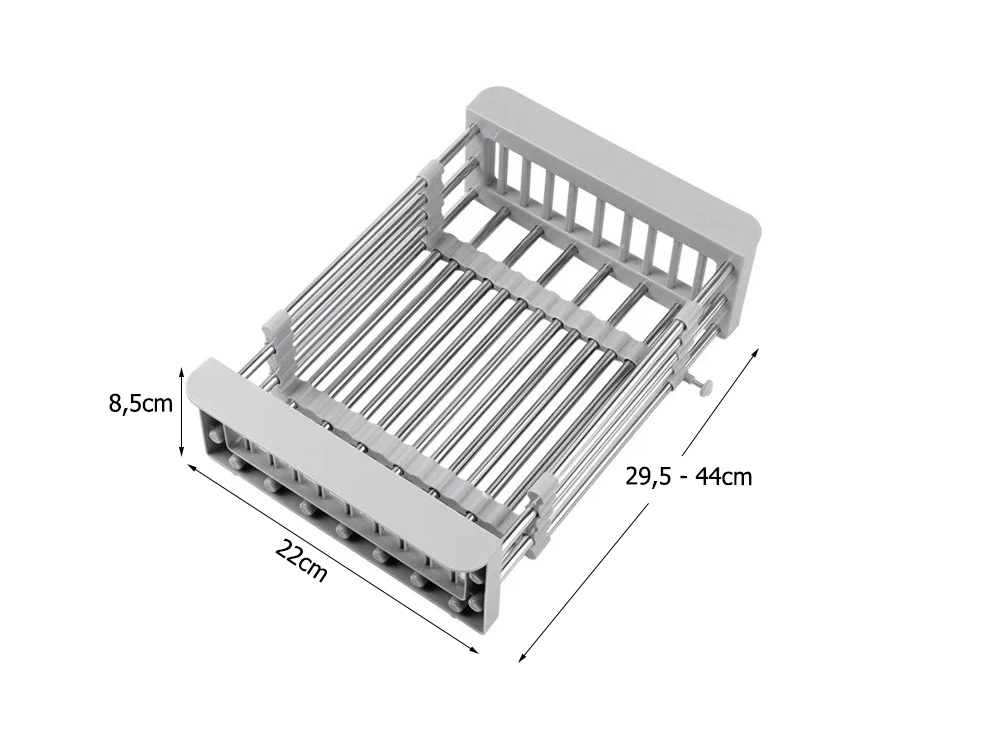 Praktisks teleskopisks izlietnes notecinātājs, kas vienmērīgi pielāgojas platumam 29,5–44 cm. Ideāli piemērots augļu un dārzeņu mazgāšanai, trauku notecināšanai un vietas taupīšanai uz virtuves virsmas. Izturīga metāla un plastmasas kombinācija, viegla kopšana un moderna pelēka krāsa.