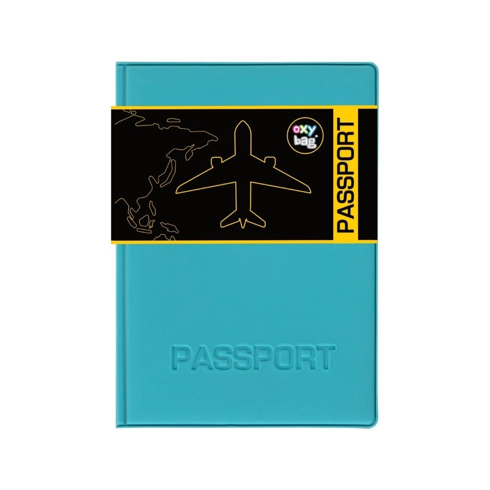 Stilīgs tirkīzzils vāciņš ar reljefu uzrakstu 'PASSPORT' un aizsargjoslu, kas uzsver ceļojuma mērķi.